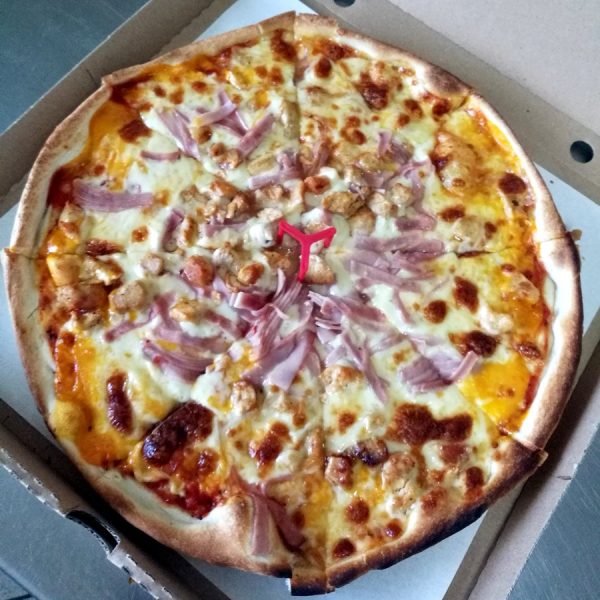 paradicsomos alap, sonka, csirkemell, füstölt sajt, cheddar, mozzarella