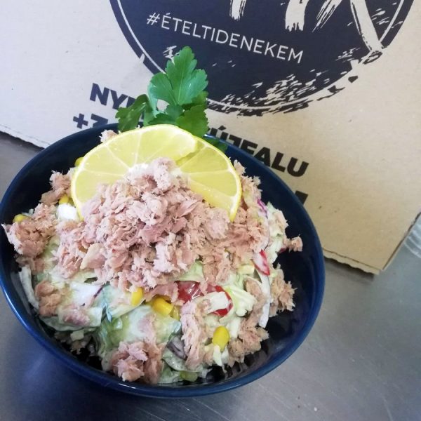 tonhal, olívabogyó, kukorica, majonéz, friss kevert saláta